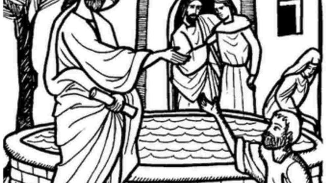 Σύμφωνα με την ευαγγελική διήγηση, εκείνη την εποχή ήλθε ο Ιησούς στα Ιεροσόλυμα. Υπάρχει δε στα Ιεροσόλυμα δίπλα της πύλης του φρουρίου που περιβάλλει την πόλη μια κολυμβήθρα με το όνομα Βηθεσδά-οίκος ελέους-(κατά τους Εβραίους) όπου γύρω της είχαν υπόστεγα και άρρωστοι που έπασχαν από διάφορες αρρώστιες εύρισκαν εκεί καταφύγιο. Όλοι αυτοί οι άρρωστοι περίμεναν πότε το νερό θα κινηθεί διότι Άγγελος Κυρίου κατέβαινε από καιρό σε καιρό στην κολυμβήθρα και τάραζε το νερό. Εκείνος που θα έμπαινε πρώτος μετά την ταραχή του νερού θα γινόταν υγιής από οποιαδήποτε αρρώστια και αν υπέφερε. Μεταξύ του πλήθους των αρρώστων υπήρχε και κάποιος, ο οποίος ήταν εκεί επί τριάκοντα οκτώ χρόνια παράλυτος. Μια ζωή γεμάτη από βάσανα και κόπους. Μέσα του όμως είχε κάτι το οποίο δεν έσβηνε ποτέ: Υπομονή-πίστη και ελπίδα στον θεό οτι μία μέρα θα γίνει καλά. Αυτή η ελπίδα φαίνεται από το γεγονός της καταφυγής και προσμονής του στην κολυμβήθρα, στον οίκο αυτόν του ελέους.