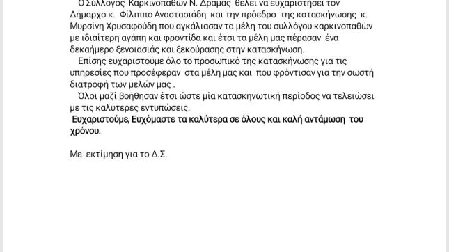·Ευχαριστούμε θερμά τον Σύλλογο Καρκινοπαθών Δράμας για την συγκινητική ευχαριστήρια επιστολή!!!