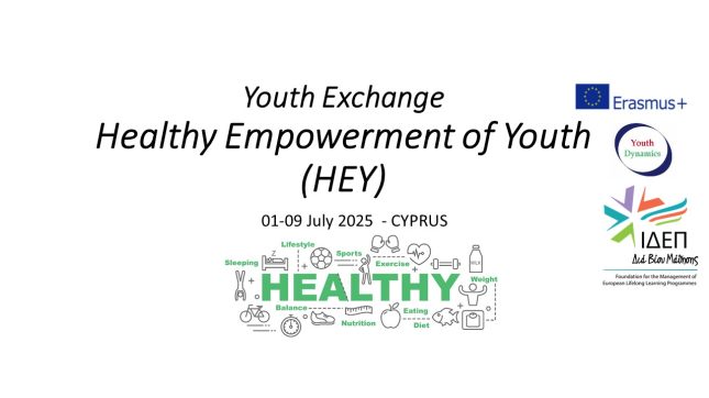 Ο Επιστημονικός Μη Κερδοσκοπικός Σύλλογος "Καινοτόμες Δράσεις στην Εκπαίδευση, τον Τουρισμό, την Υγεία και τον Διαπολιτισμό" (ΚΔΕΤΥΔ) ανακοινώνει με ενθουσιασμό τη συμμετοχή του στο ευρωπαϊκό πρόγραμμα "Υγιής Ενδυνάμωση των Νέων" (Healthy Empowerment of Youth - HEY). Το πρόγραμμα διεξάγετε στα Περβόλια της Λάρνακας, στην Κύπρο, από την 1η έως τις 9 Ιουλίου 2025.